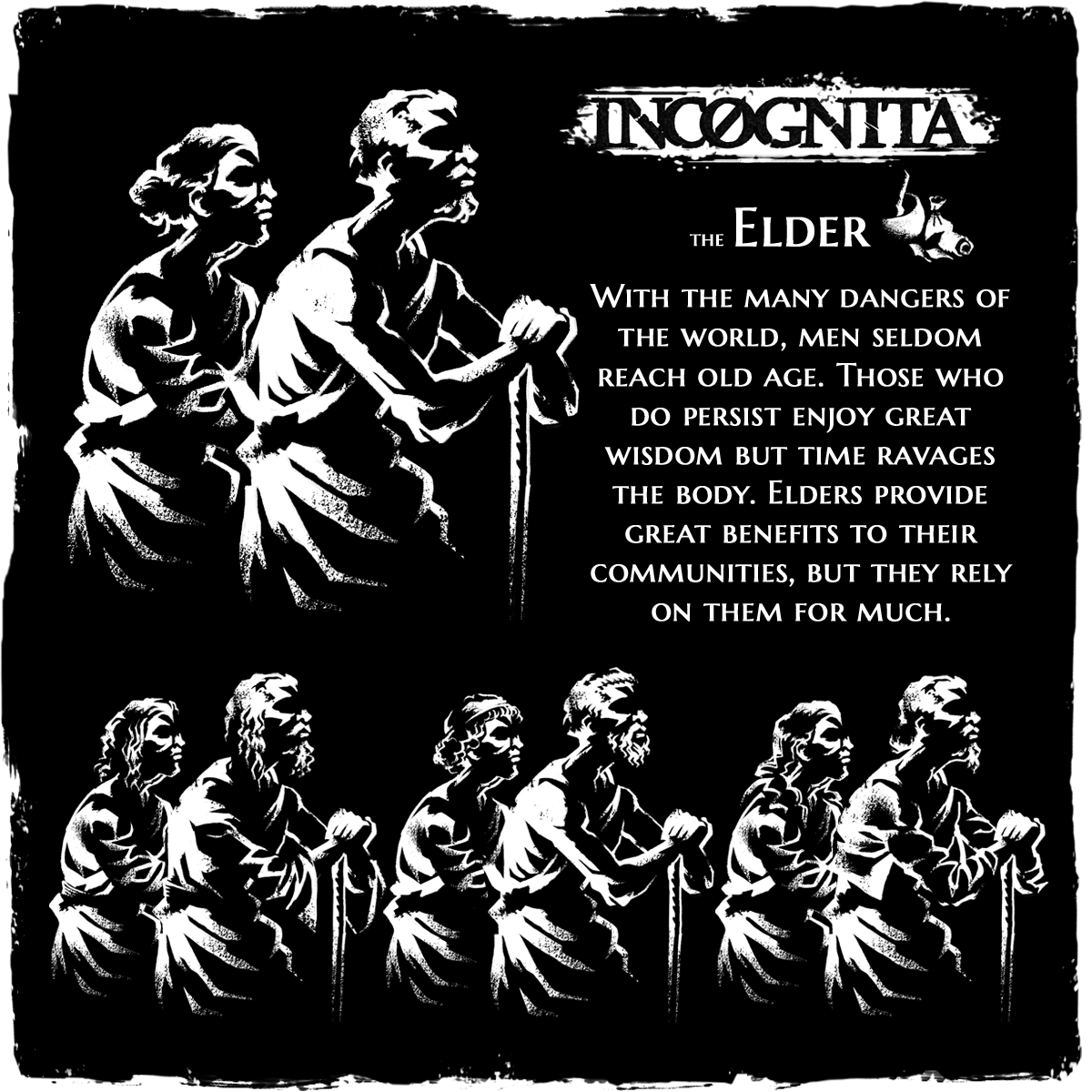 Though not entirely uncommon, living to old age is definitely a challenge in a time before our modern medicine and stability. Elders are healers, having learned their traditional medicine from a lifetime of observation and practice. Elders would be more sought after as party companions if not for the frailty of their bodies, as they have a much reduced capacity for punishment compared to other party members.
